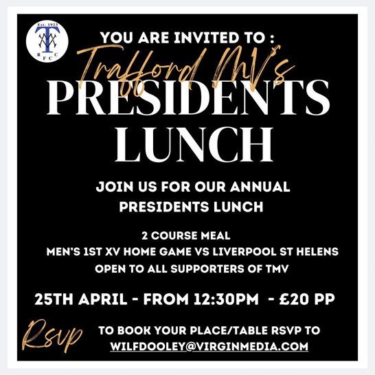 We will be hosting this seasons Presidents Lunch on Saturday April 25th with a meet time of 12.30pm for a 1.00pm sit down.